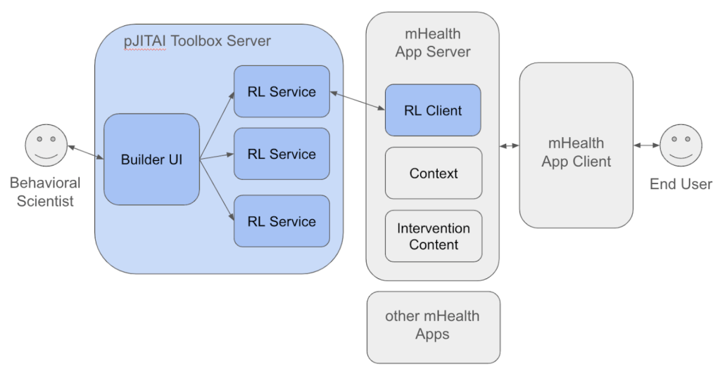 The personalizing Just-In-Time Adaptive Intervention (pJITAI) Toolbox, is a no-code web-based platform to allow mobile health researchers to create, configure, and deploy Reinforcement Learning (RL) algorithms for mHealth interventions. [click]